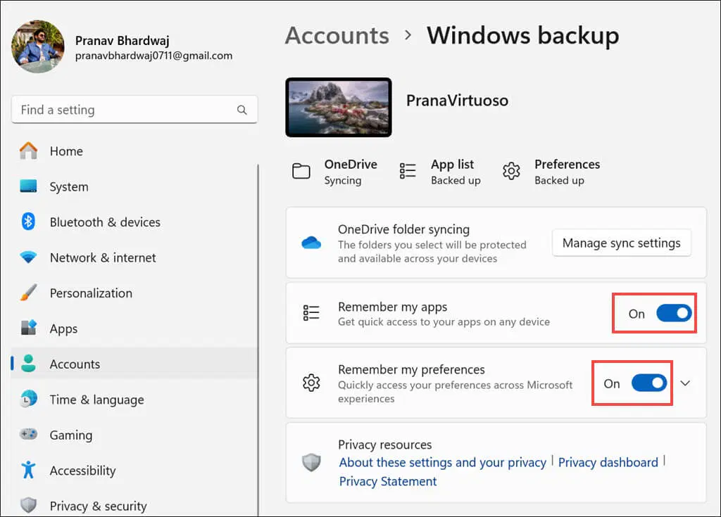 Mielőtt elindítaná és elindítaná a biztonsági mentést a Windows Biztonsági mentés alkalmazással, indítsa el a Windows beállításait, és lépjen a Fiókok > Windows biztonsági mentés elemre. Itt kapcsolja be az Alkalmazásaim megjegyzése és a Beállításaim megjegyzése opciókat.