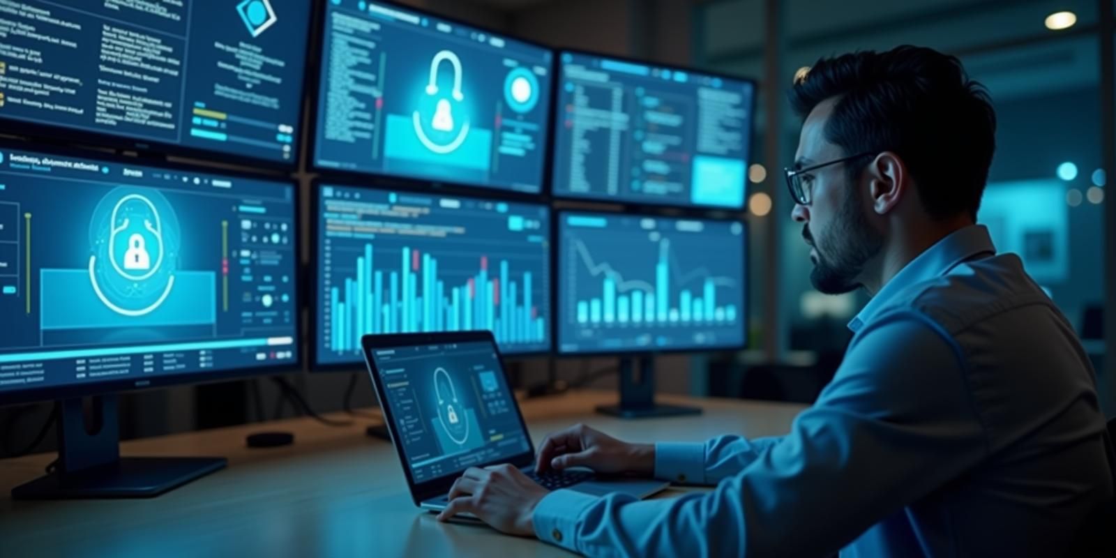 A borító képet FLUX.1-dev képgenerátor készítette az alábbi prompt alapján: A professional in a modern office environment analyzing secure data visualization on multiple screens, with AI security protection symbols, digital locks, and a futuristic interface showing data classification.